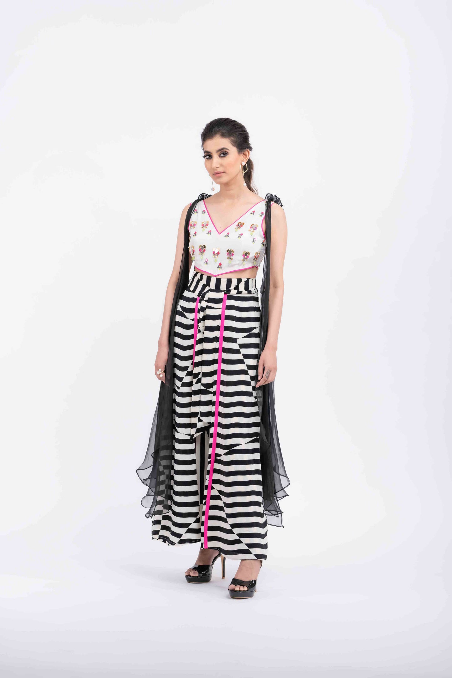 Cutout jumpsuit made in crepe fabric with an embellished bodice. Comes with a stylish organza cape with crystal and frill detail.