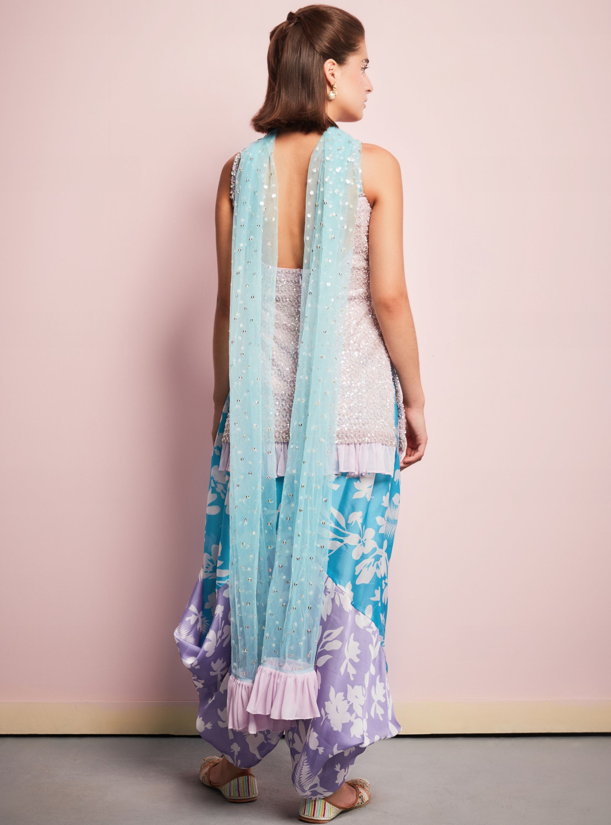 Featuring a lavender & blue sequins embroidered Kurta with a satin printed salwar.It is paired with a blue coloured dupatta with frill detail.