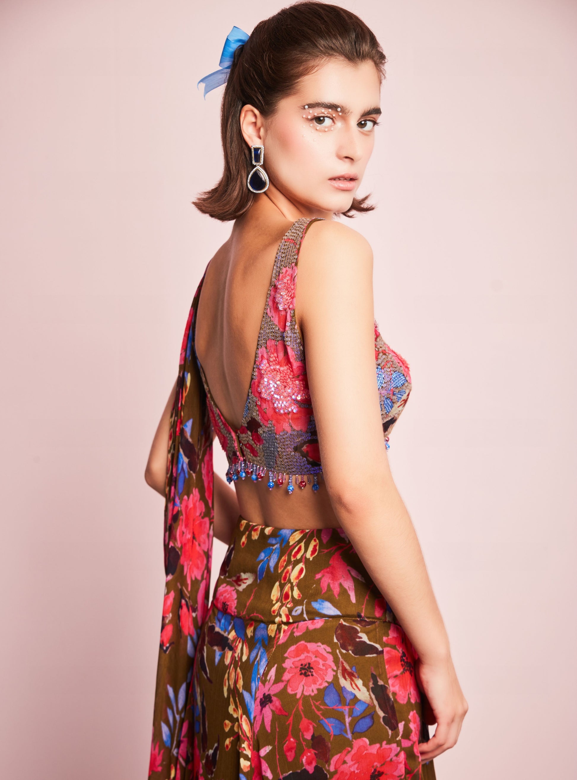 Featuring a Red and mocha printed blouse with sequins and crystal work paired with a matching printed drape skirt .