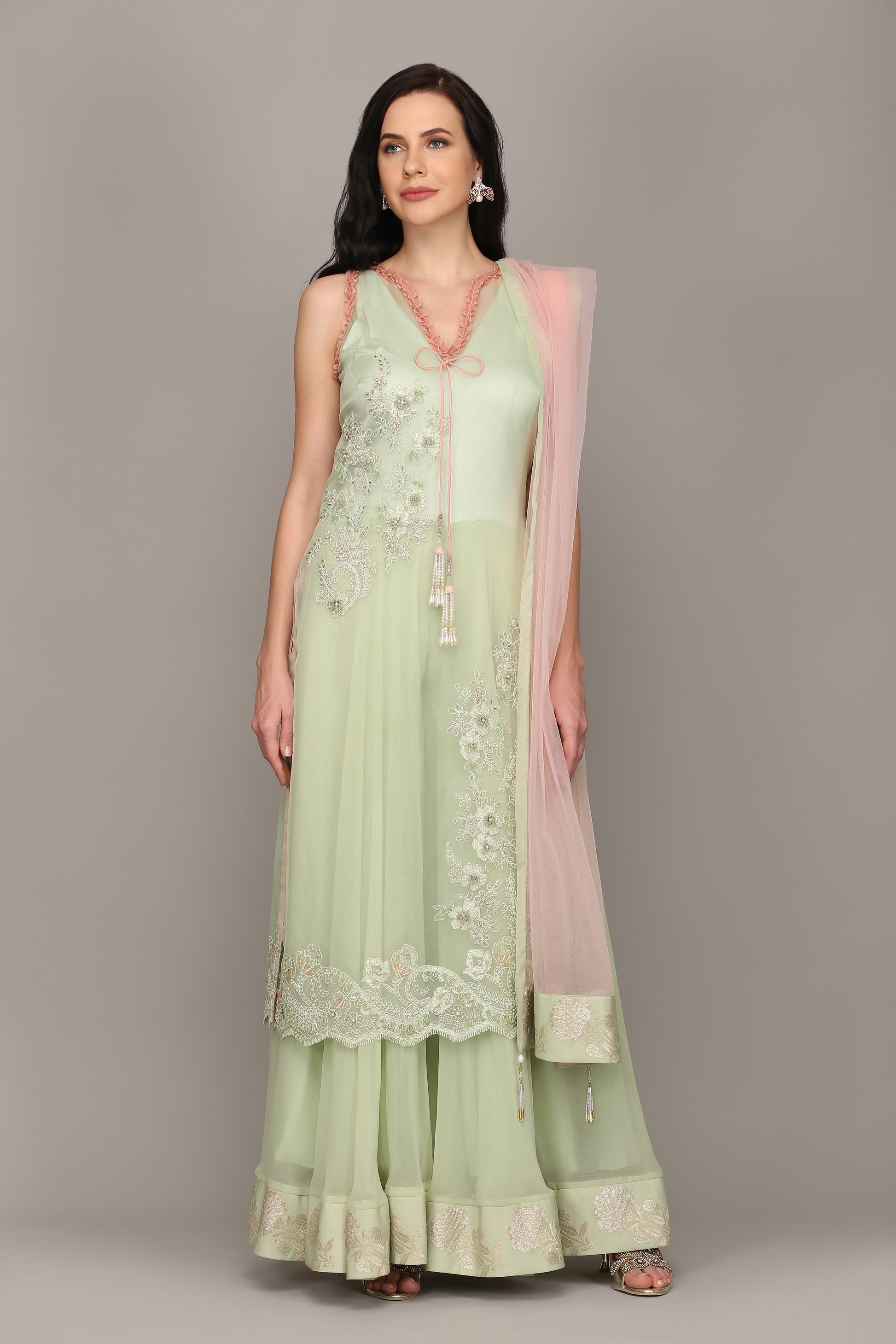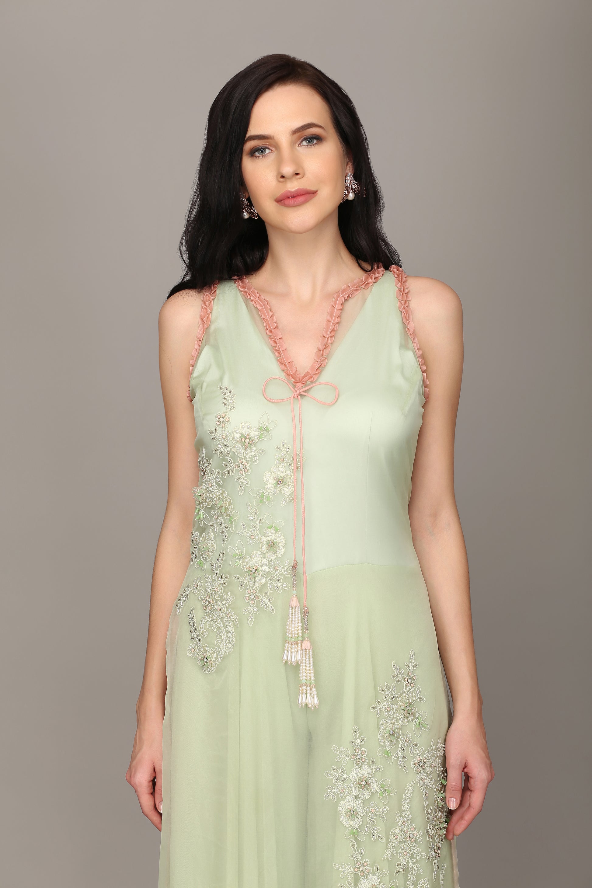 Organza Kurta with Chantilly, crystal, pearl, stone work and tie up detail