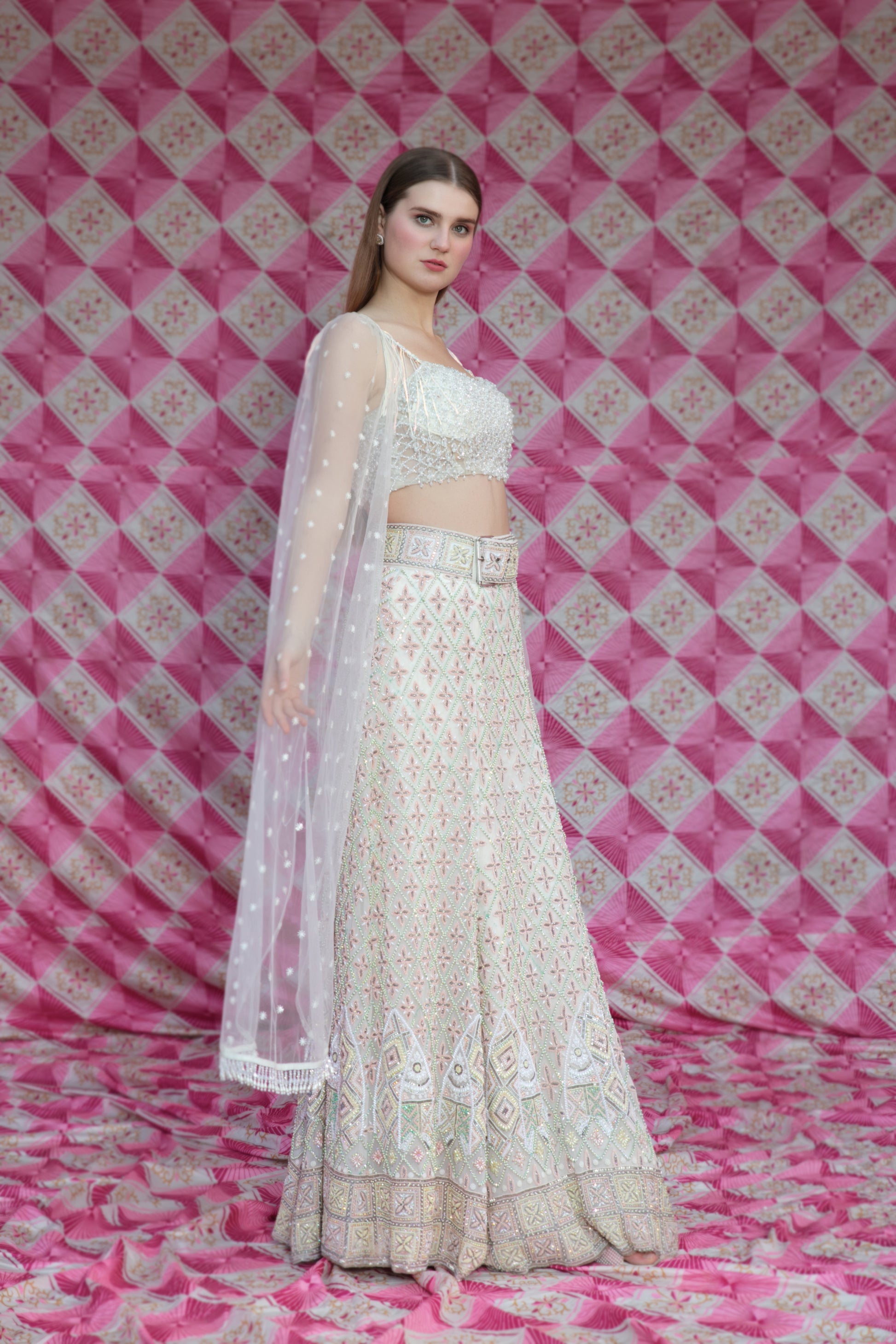 White hanging crystal embroidered blouse with attached tulle cape sleeves; crystal, multi color pastel thread, sequin, French knot embroidered lehenga all in hands work on a georgette base.