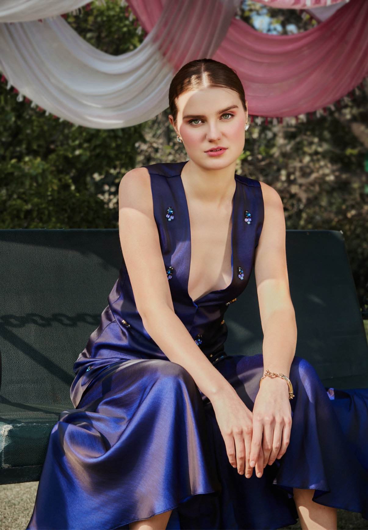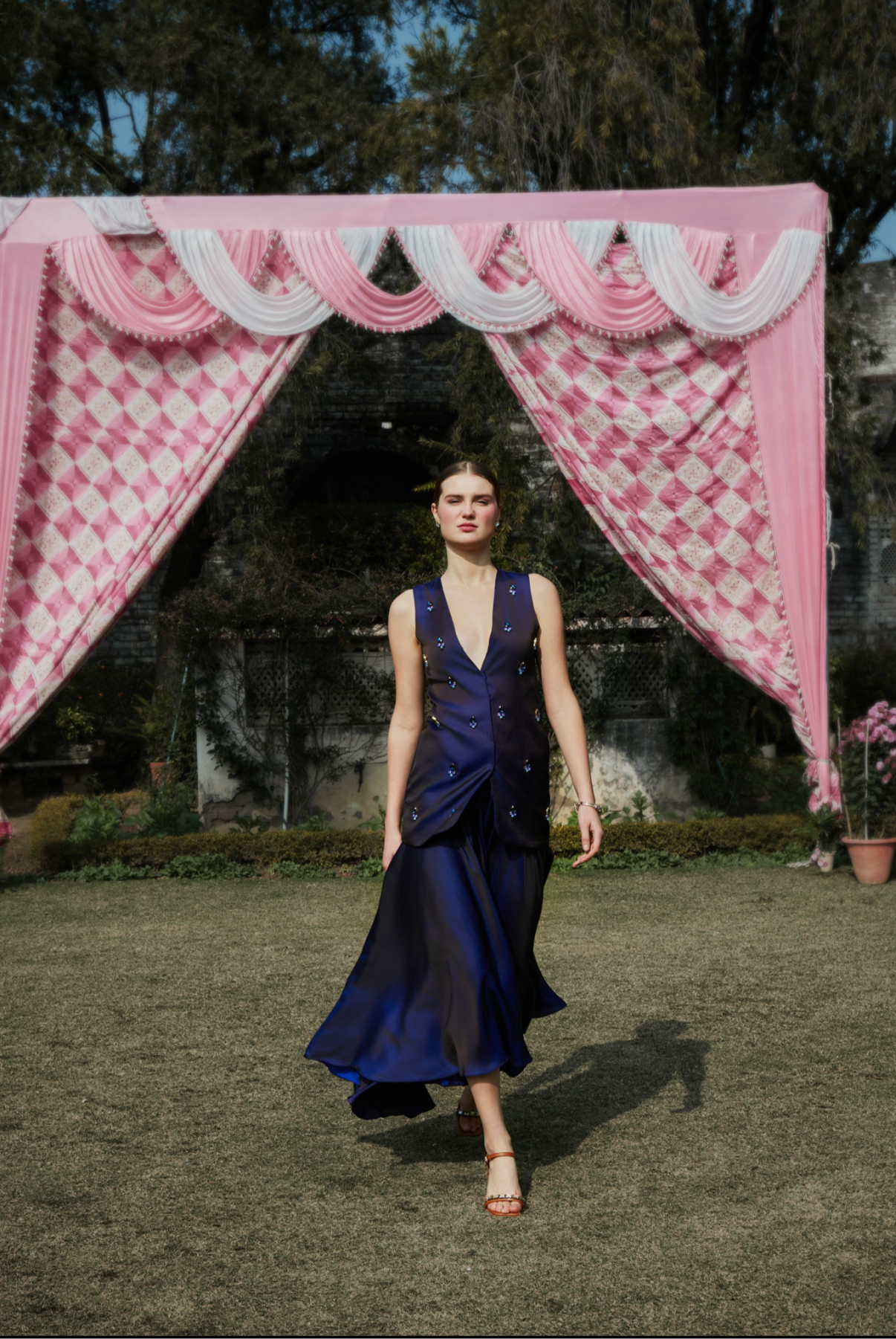 Blue and black two tone viscose blend silk georgette embellished vest with matching culotte pants