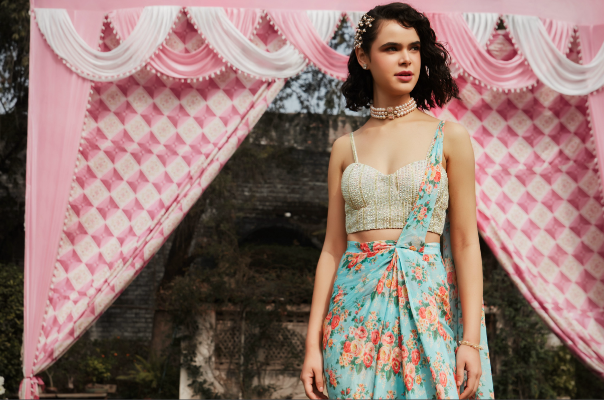 Printed crepe pre draped Saree with bouquet print and frill detail; crystal and pearl embellished corset blouse