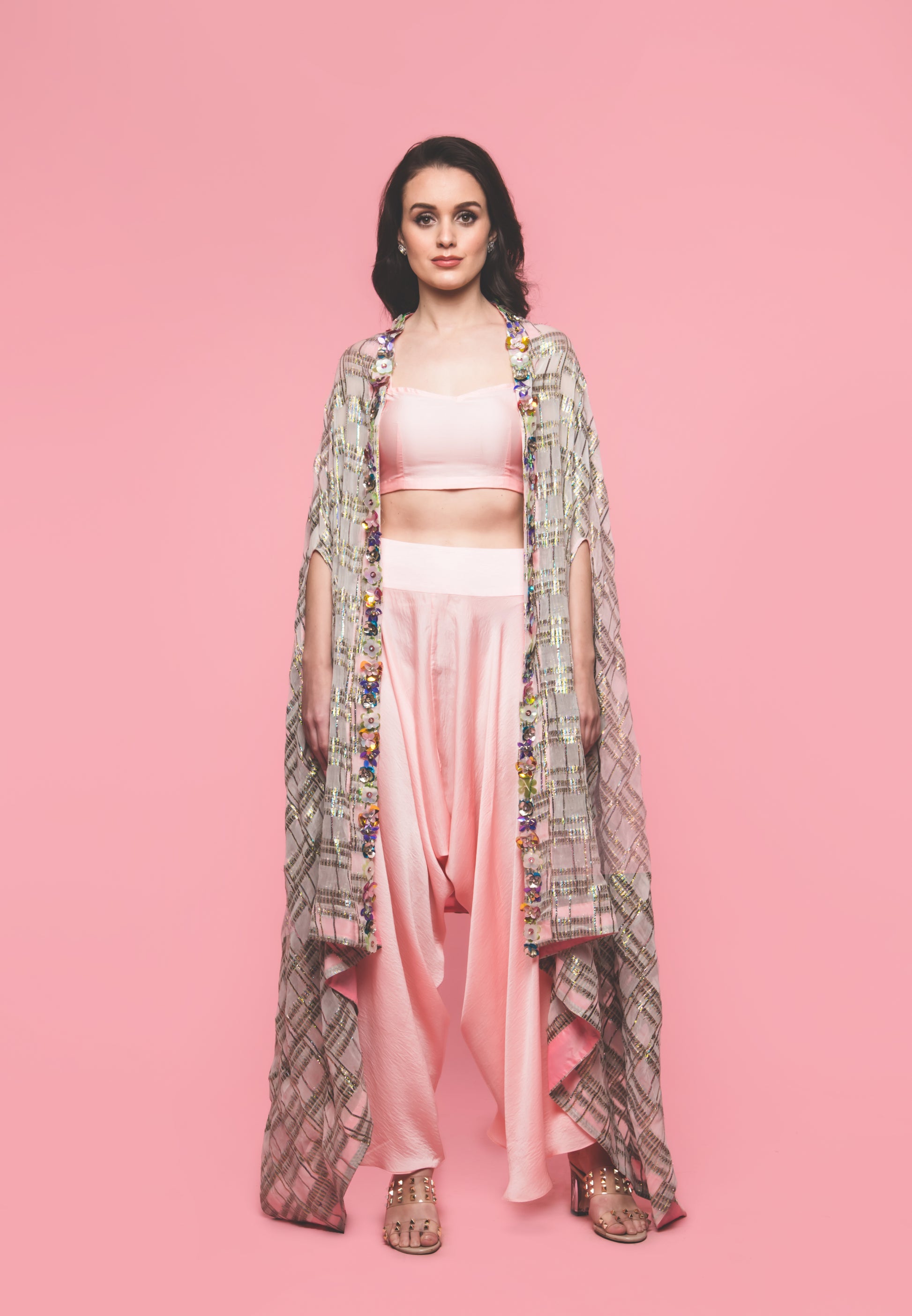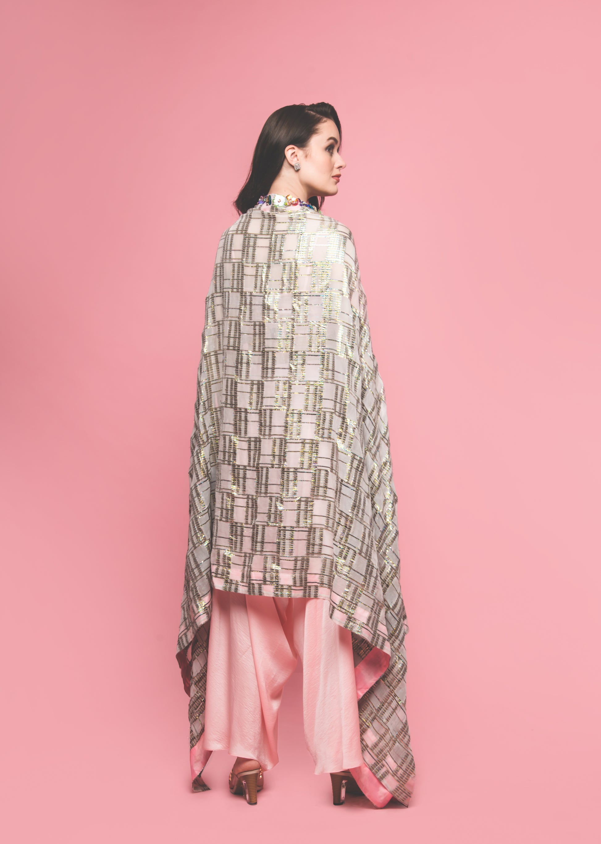 Pearl, crystal, Sequin beaded Lurex georgette cape with contrast silk finish