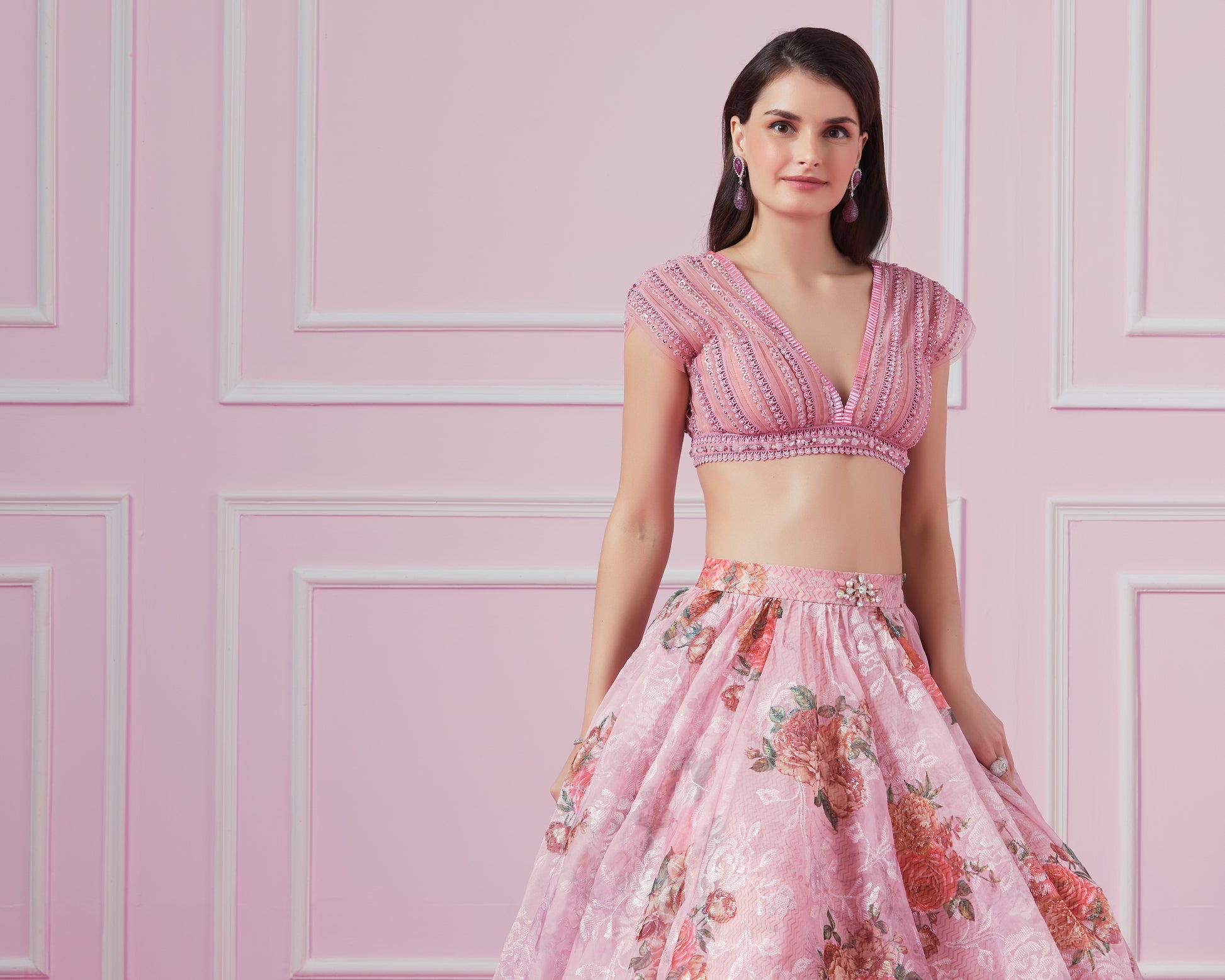 Embroidered printed organza lehenga with goemetric printed satin lining, embroidered blouse, net duppatta with organza ruffle border