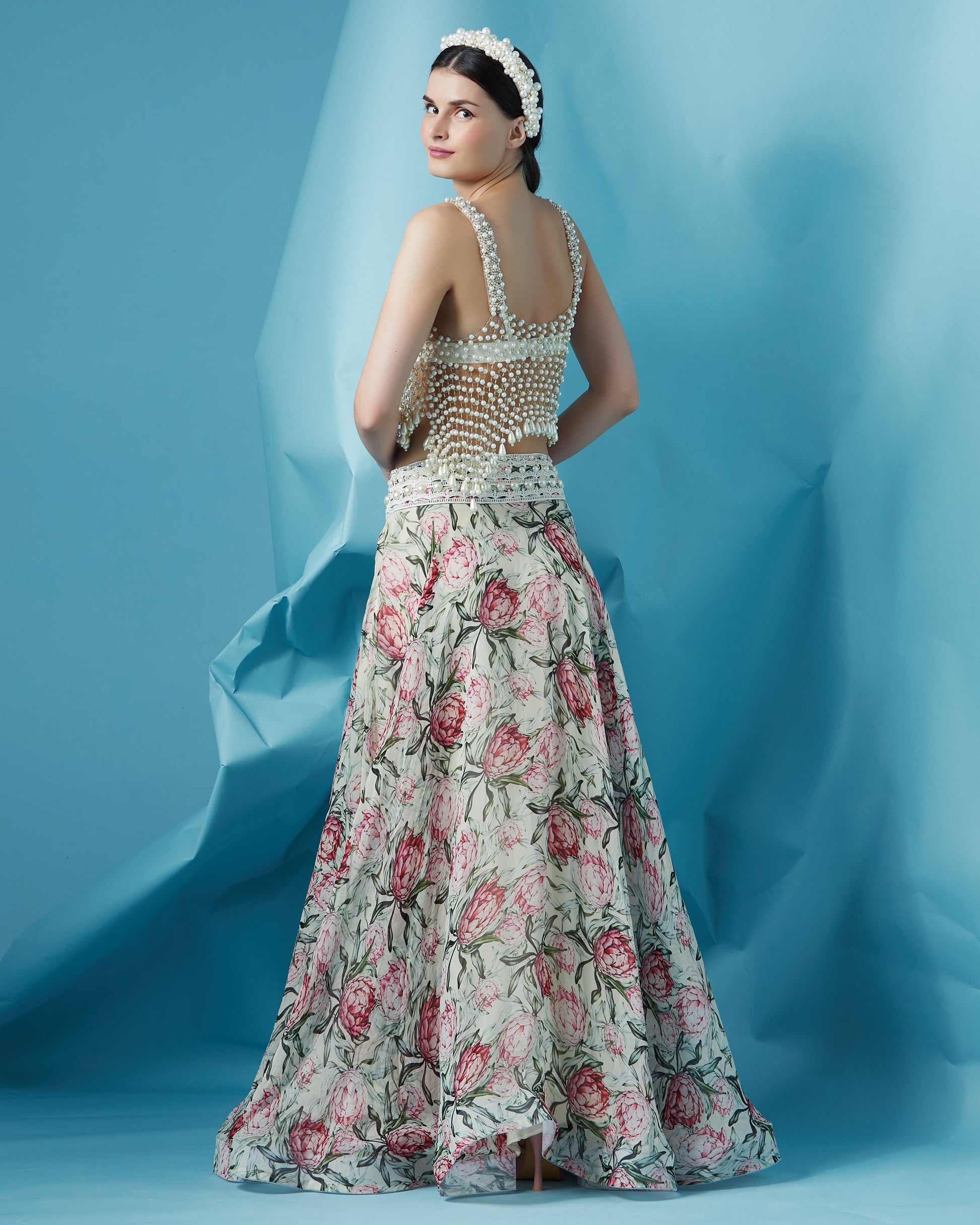 Pearl Embroidered blouse with satin bralet, organza skirt with lace and pearl details