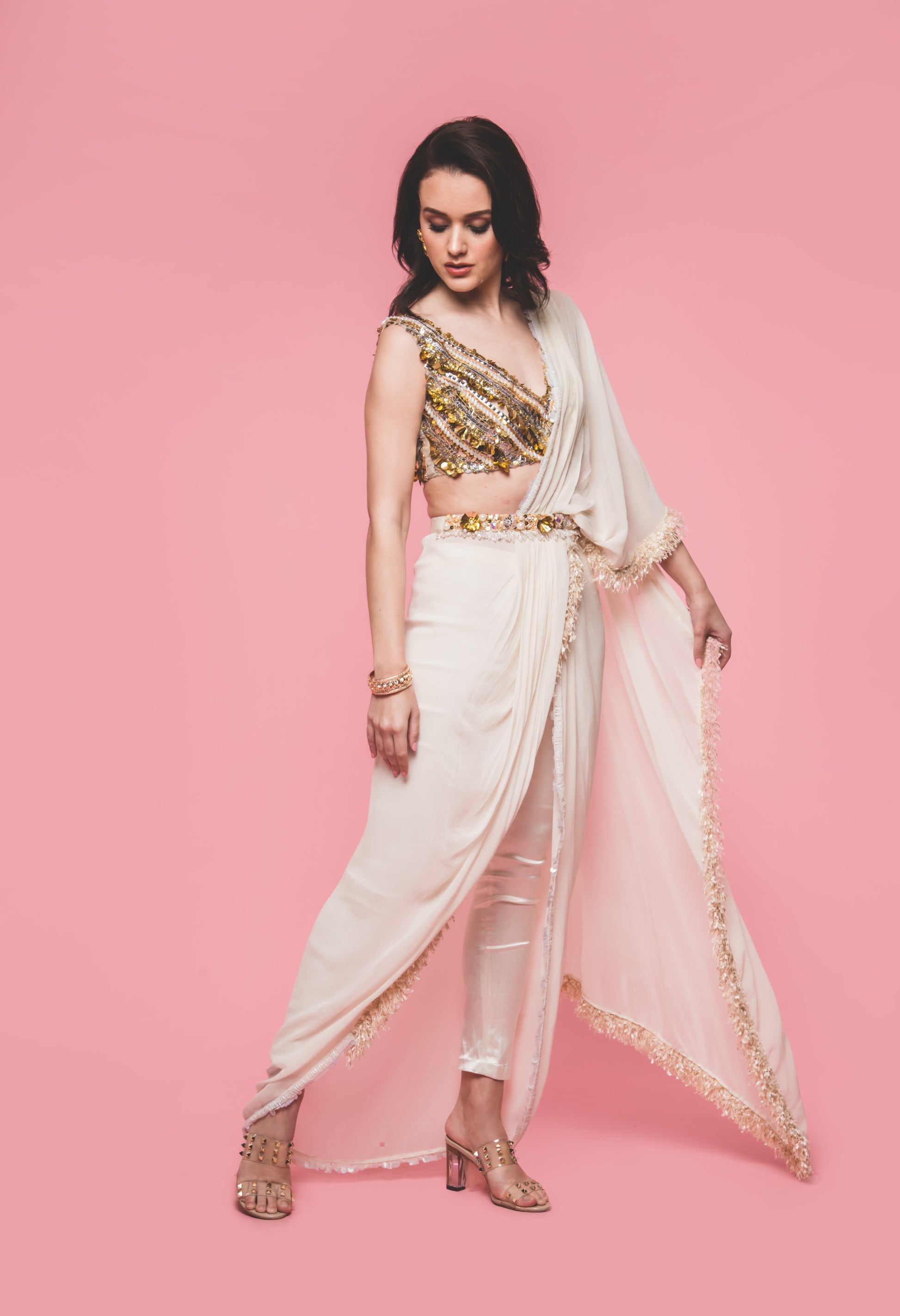 Georgette draped Saree with fringe detail, comes with a beaded belt to wear over Saree