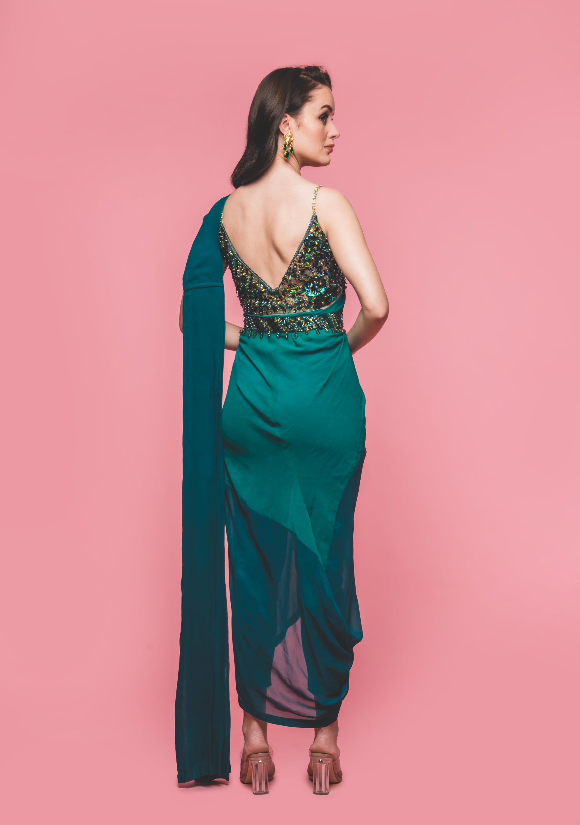 Dual shade georgette pre draped Saree