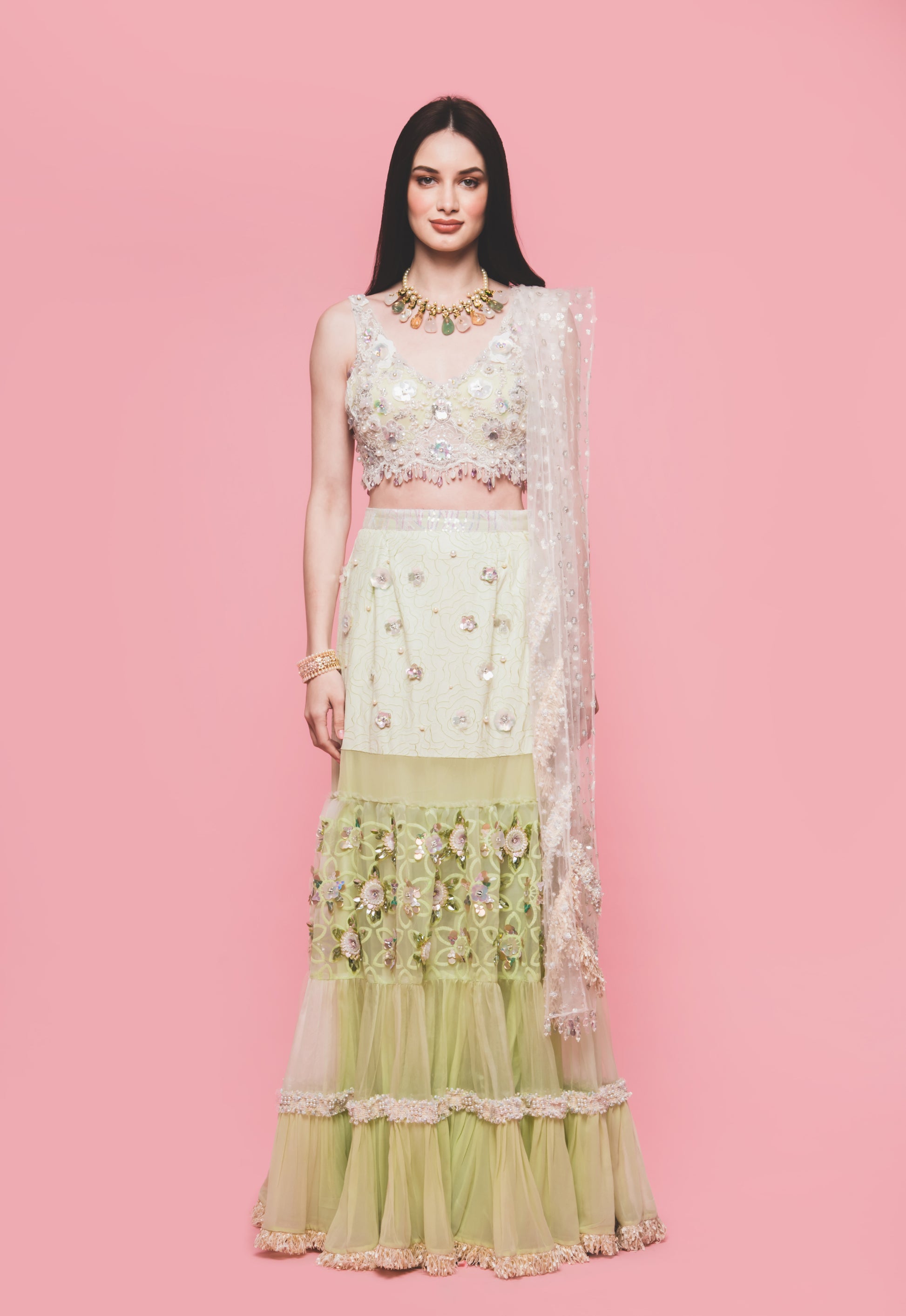 Artificial leather, georgette, tulle skirt beaded with pearl, sequin and crystals