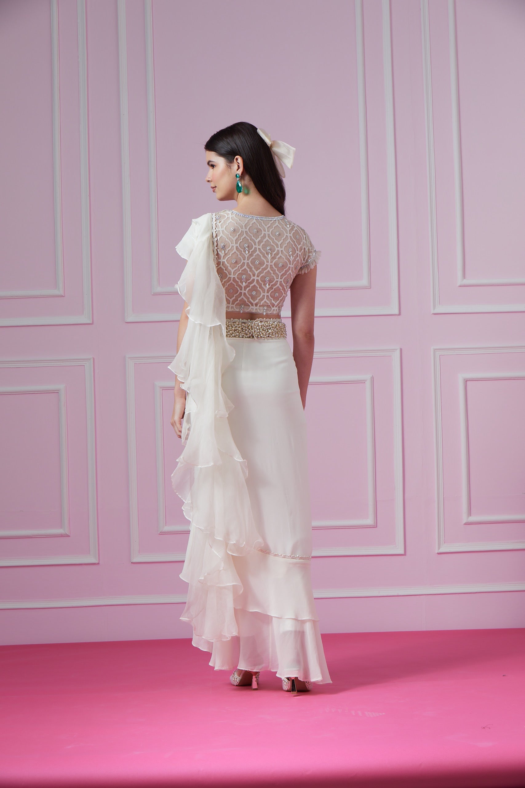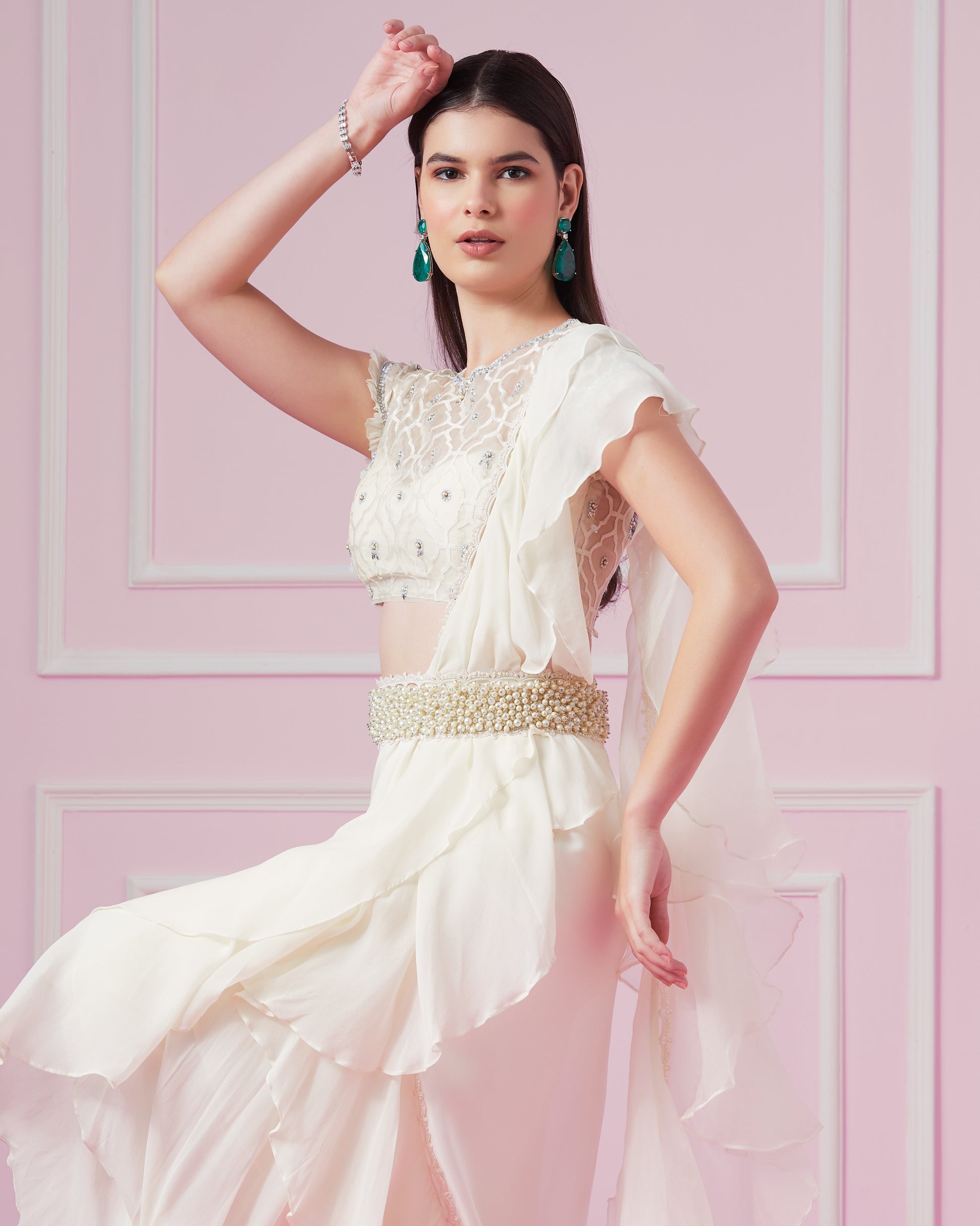 pearl, cystal embroidered organza blouse with goergette ruffled saree and pearl beaded belt with lace details