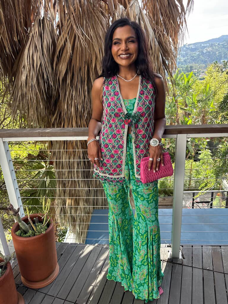 Intricately embroidered vest with French knots, diamantés and pearl work; Paired with floral printed georgette Sharara pants with broach and tassel detail.