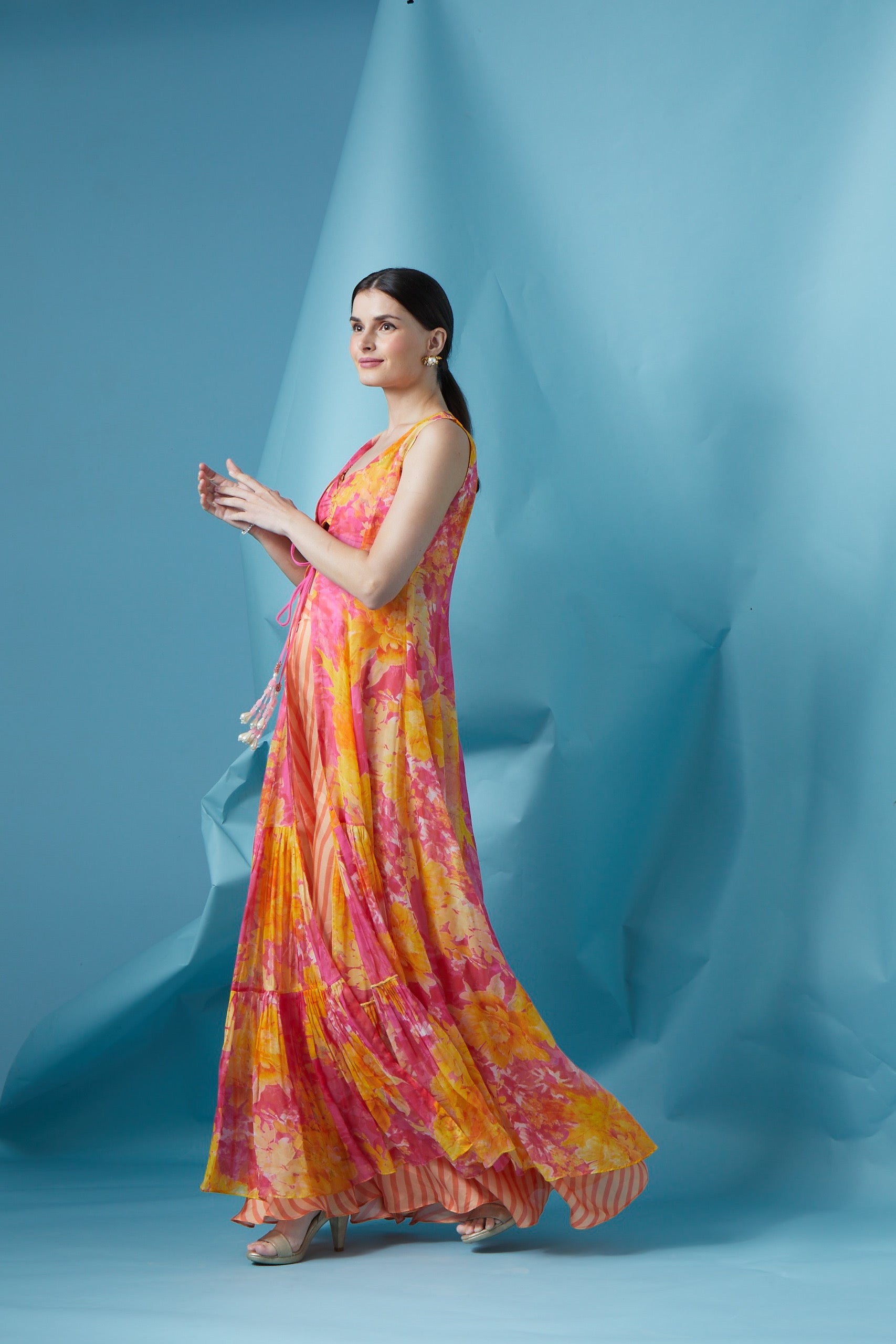 Organza Cape with rouged bralet inner, wide leg satin stripe pants