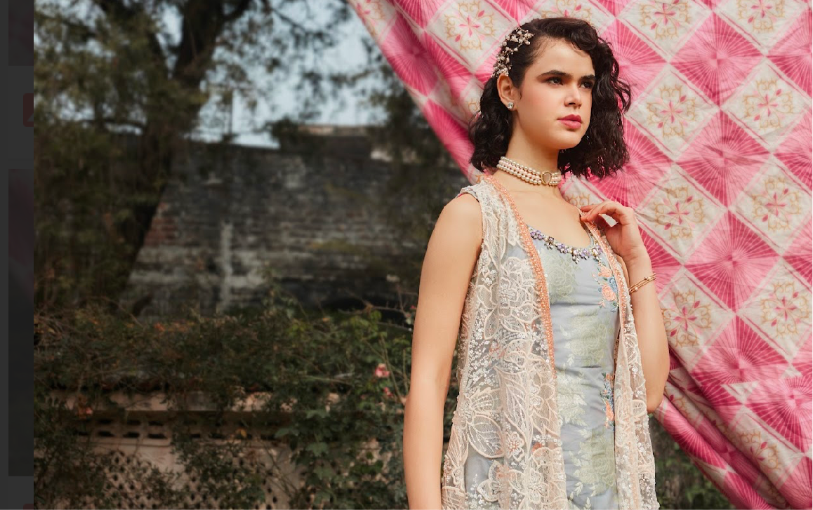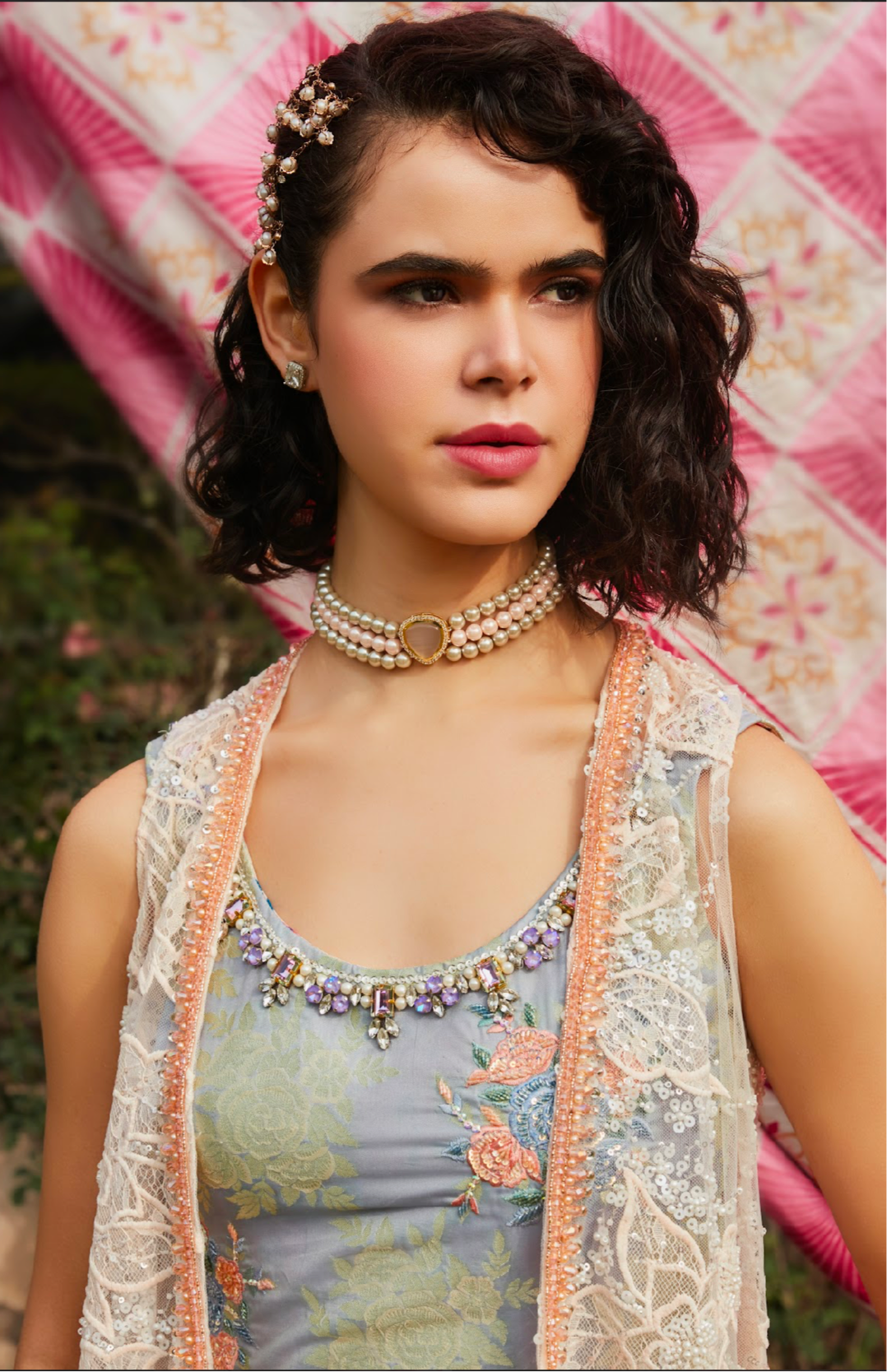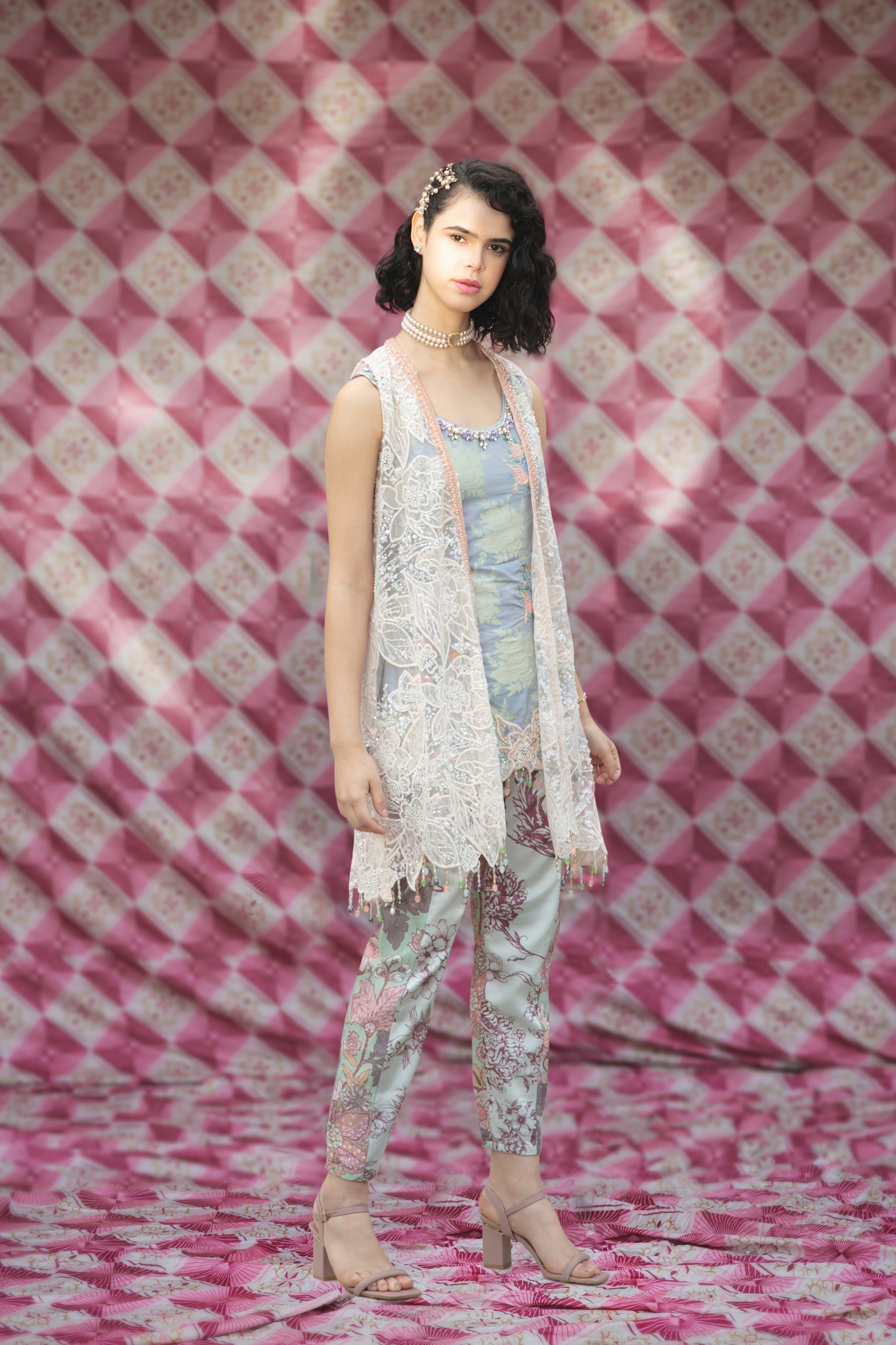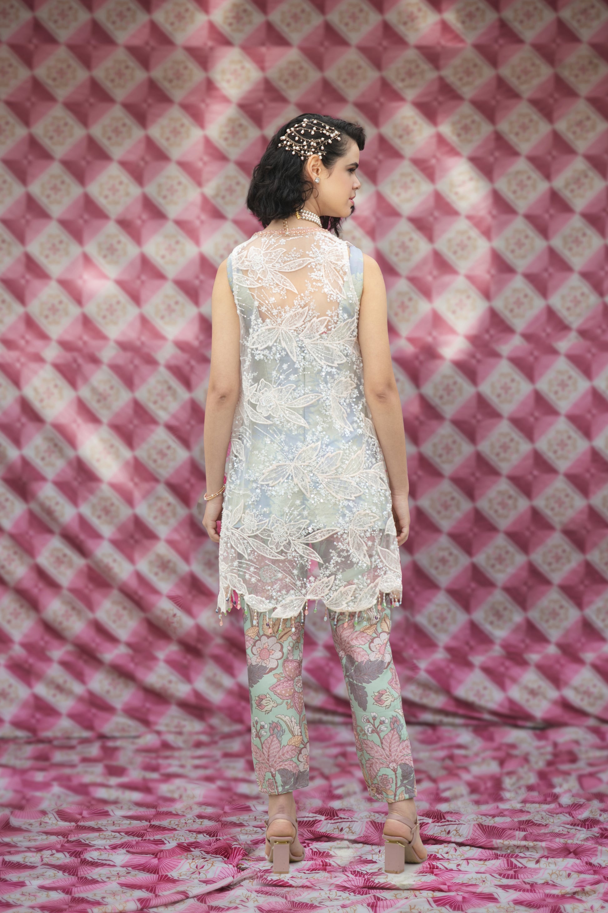 Printed satin balloon pants; brocade bouquet design embroidered kurta and lace vest with pearl and crystal border