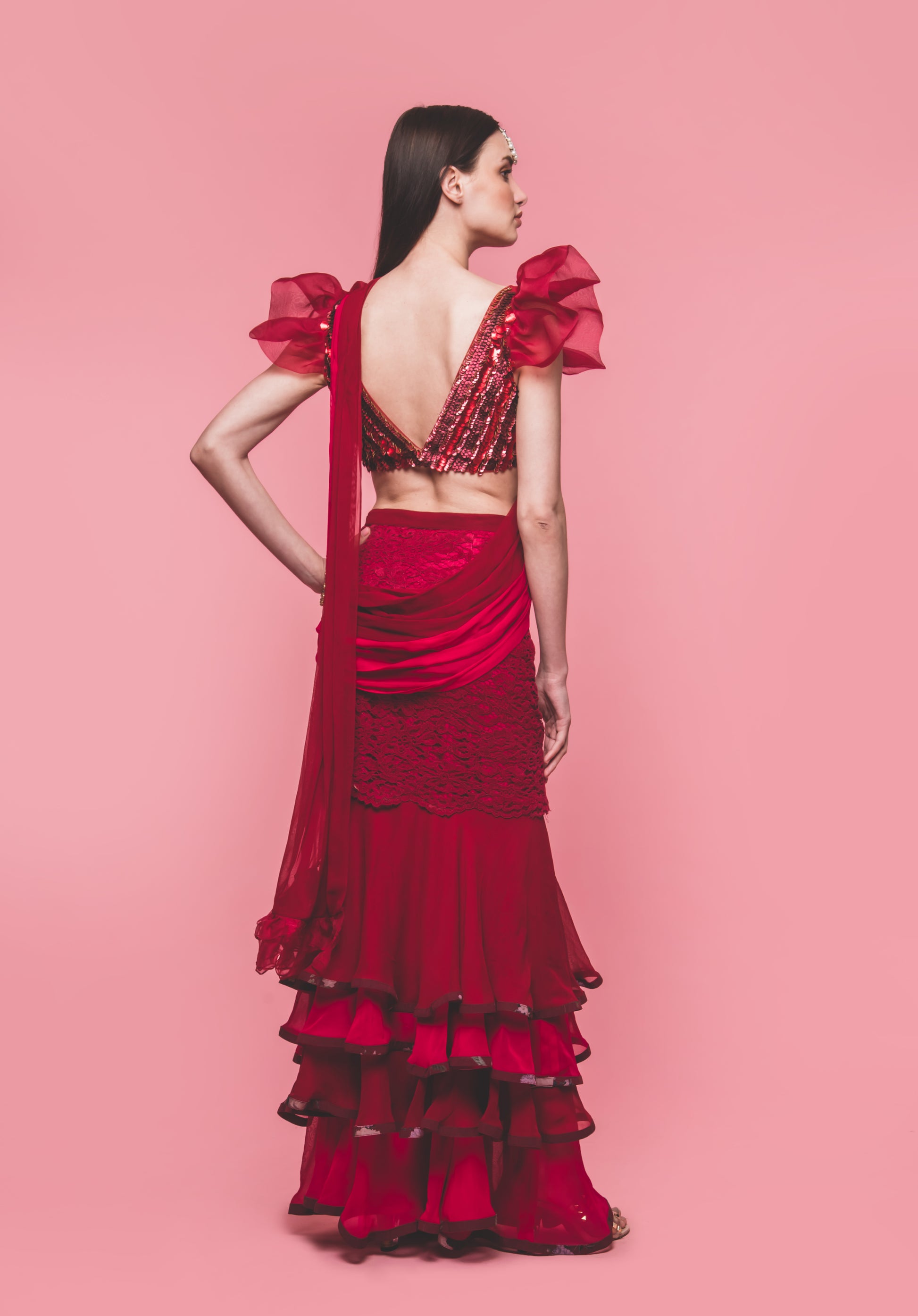 Sequin beaded blouse with Organza ruffled sleeves with low cut neck and back