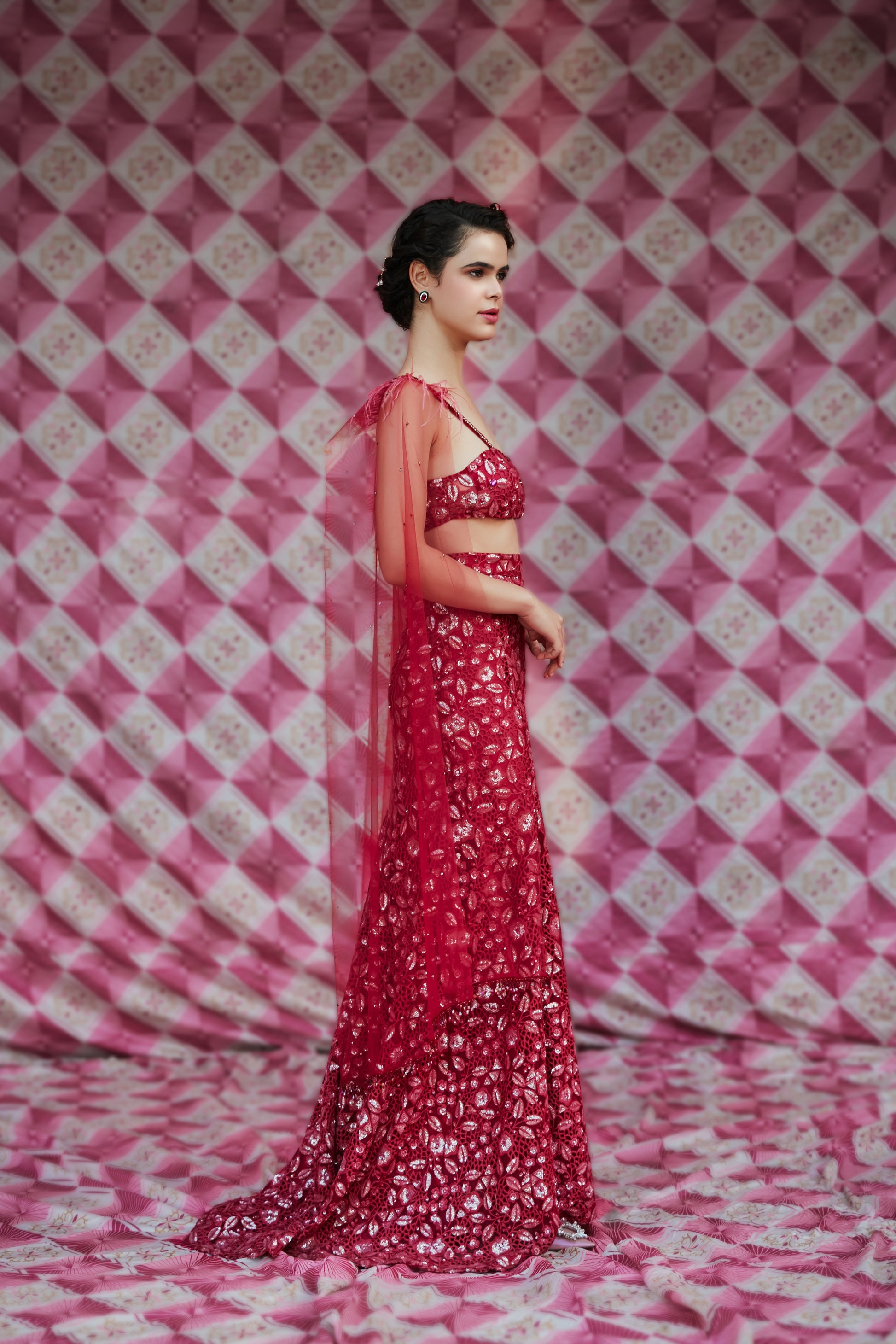 Embroidered lace 2 piece Lehenga set. Attached cape style dupatta with feather and crystal details.