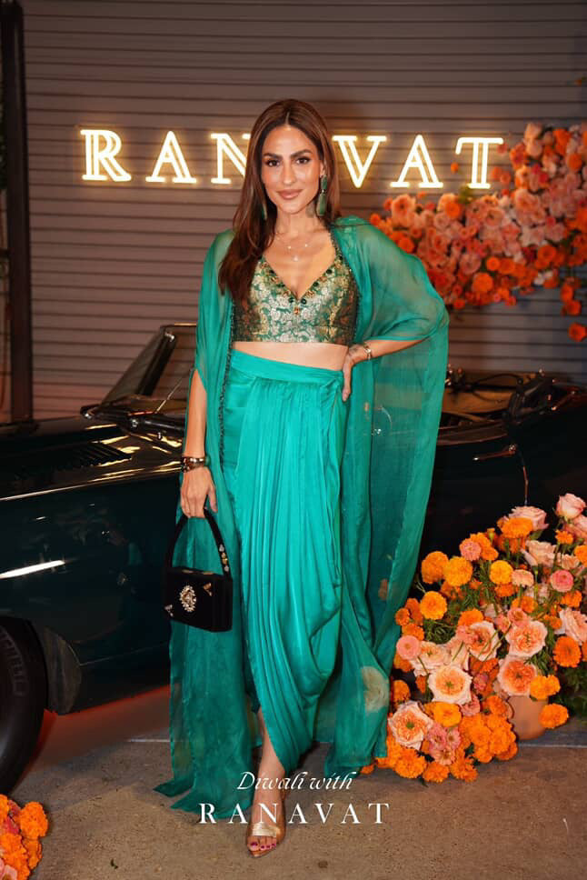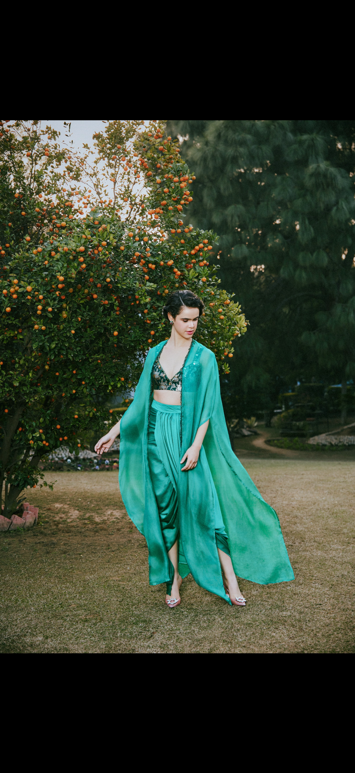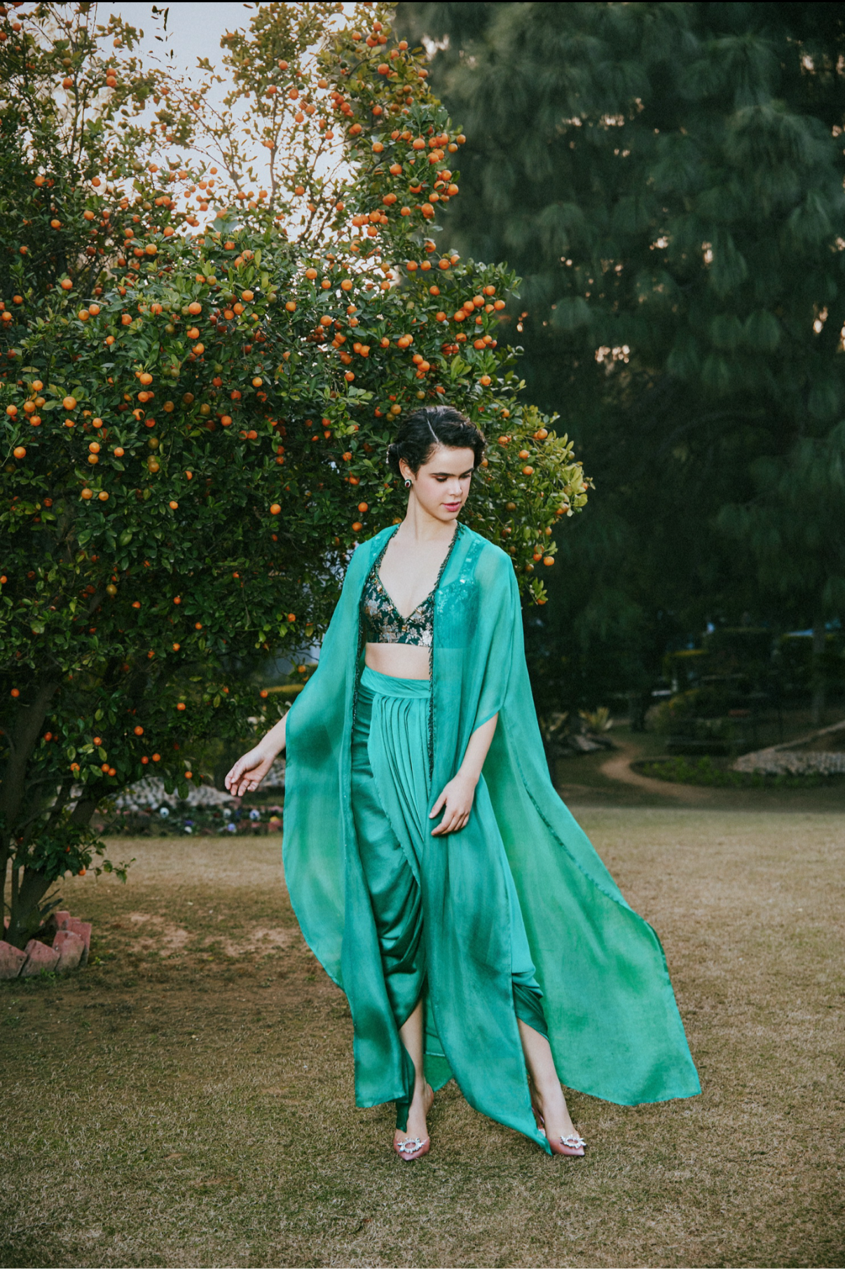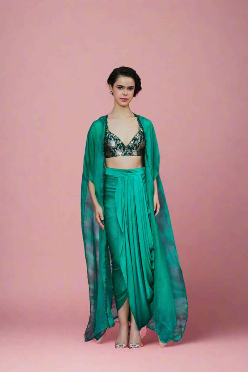 Pure silk draped skirt set with silk organza cape and an embellished brocade blouse in a bright Embrald color