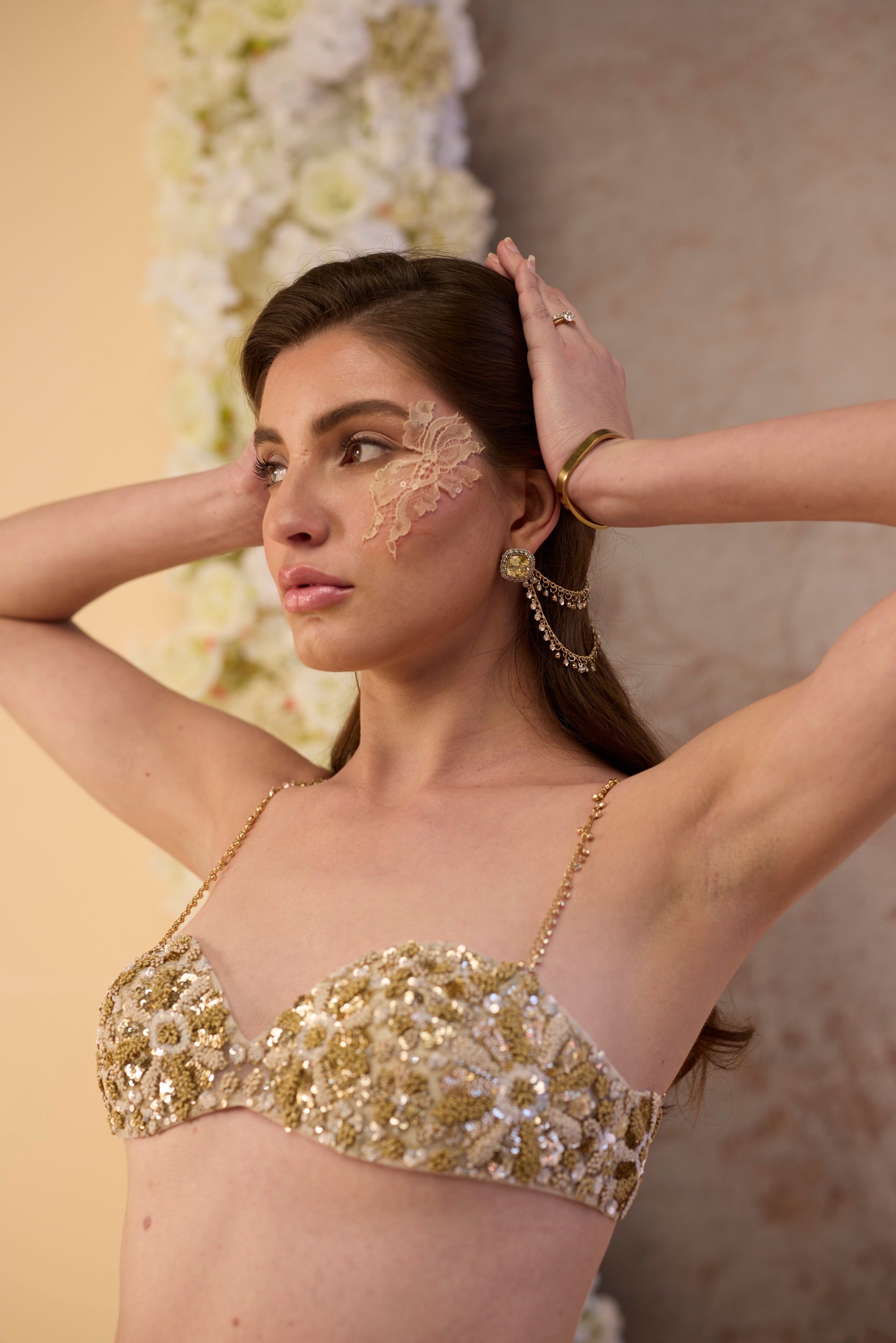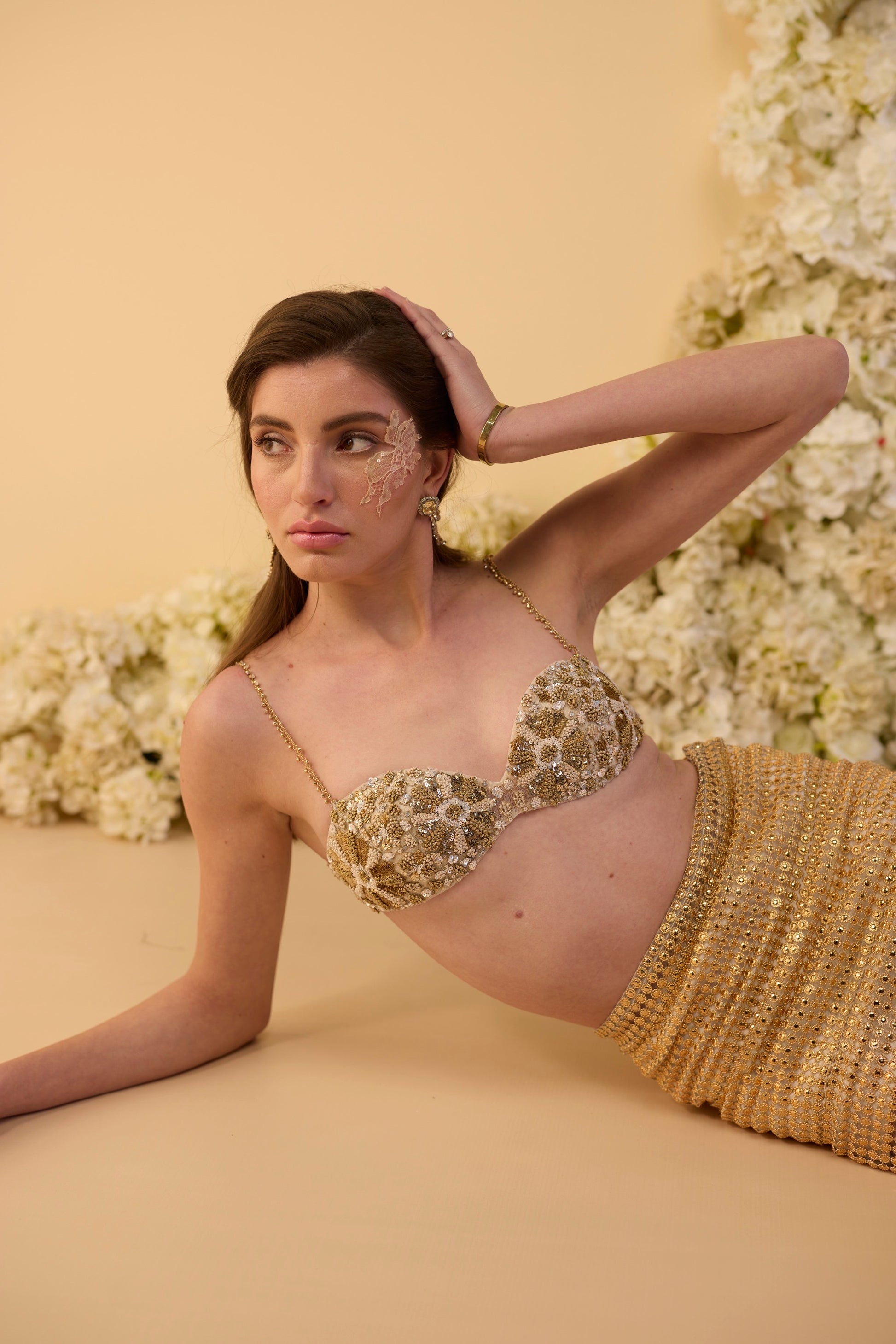 A luminous gold set featuring a hand-embellished bralette and fluid draped skirt. Elegant, sculpted, and designed for modern celebrations.